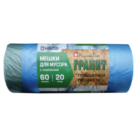 Мешки для мусора, 60 л, завязки, синие, в рулоне 20 шт., ПНД, 15 мкм, 60х70 см, прочные, КОНЦЕПЦИЯ БЫТА "Гранит"