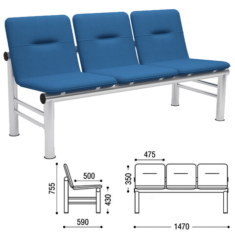 Кресло для посетителей трехсекционное "Троя", 755х1470х590 мм, светлый каркас, кожзам синий, СМ 105-03 К20