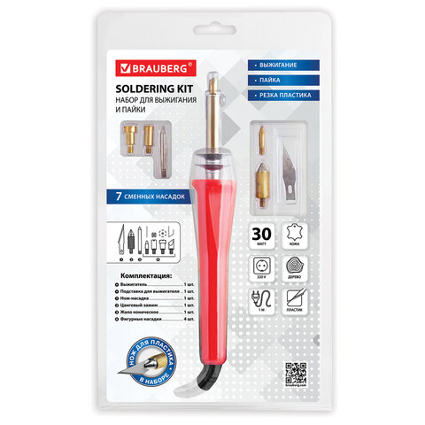 Набор для выжигания и пайки BRAUBERG, 6 насадок + нож для резки пластика, красный