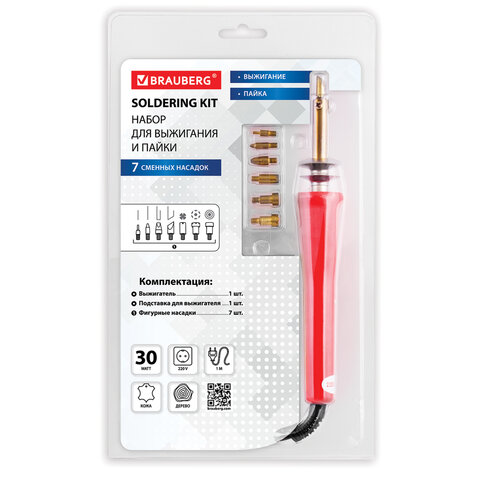 Набор для выжигания и пайки BRAUBERG, 7 насадок, красный, в блистере