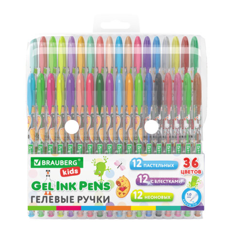 Ручки гелевые BRAUBERG KIDS "CUTE ANIMALS", НАБОР 36 ЦВЕТОВ, корпус с печатью, узел 1 мм, линия письма 0,7 мм