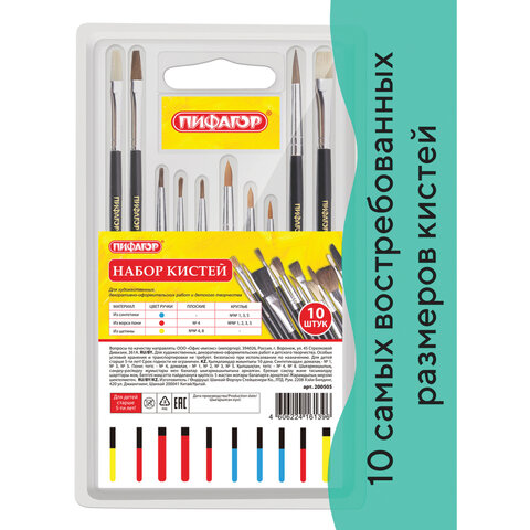 Набор из десяти кистей разного размера и типа ворса ПИФАГОР предназначен для детского творчества в образовательных учреждениях и дома.Дополнительно