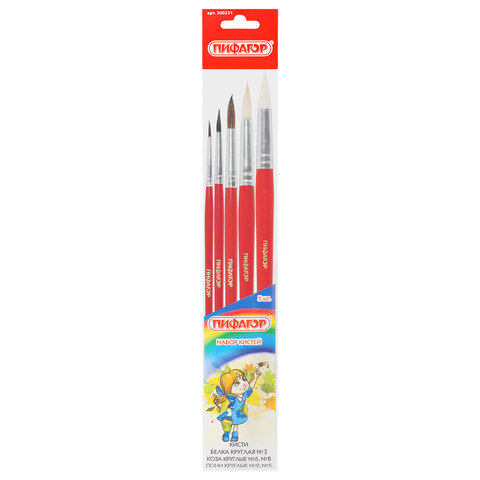 Кисти ПИФАГОР, набор 5 шт. (БЕЛКА: круглая № 3; КОЗА: круглые № 6, 8; ПОНИ: круглые № 2, 5), пакет с европодвесом