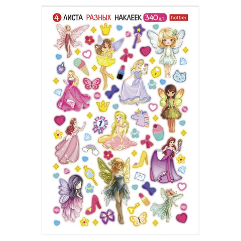 Наклейки бумажные для девочек, НАБОР 4 листа, 336 наклеек, HATBER, 4Н5н