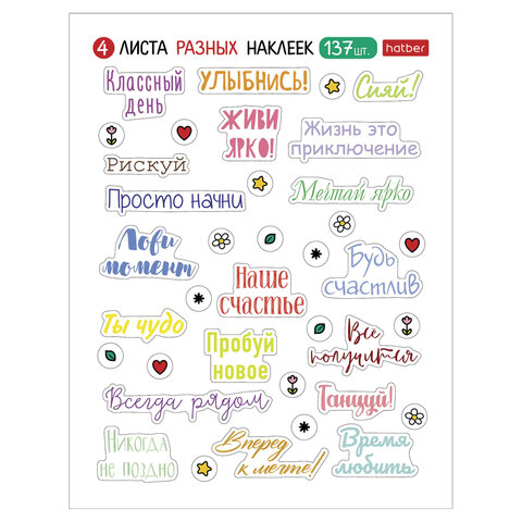 Наклейки бумажные, мотивирующие фразы и пожелания, НАБОР 4 листа, 137 наклеек, HATBER, 4Н6н