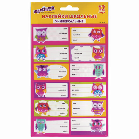 Наклейки для маркировки школьных принадлежностей "Совы", 12 штук, 14х21 см, ЮНЛАНДИЯ