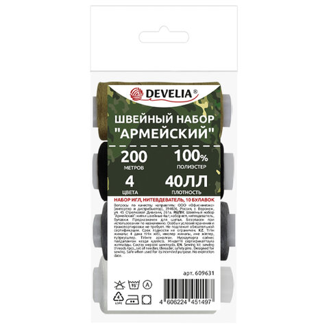 Набор швейный "Армейский", 40 ЛЛ, 200 м, 4 цвета, иглы, нитевдеватель, булавки, DEVELIA (Девелиа)