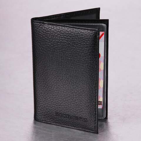 Обложка для автодокументов и паспорта натуральная кожа флоттер, "DOCUMENTS", черная, BRAUBERG 238193