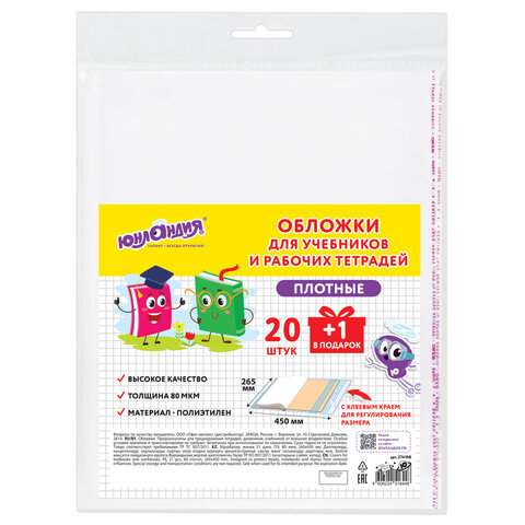 Обложки ПЭ для учебников и рабочих тетрадей, КЛЕЙКИЙ КРАЙ, НАБОР 20 шт. + 1 шт. в ПОДАРОК, 80 мкм, 265х450 мм, ЮНЛАНДИЯ