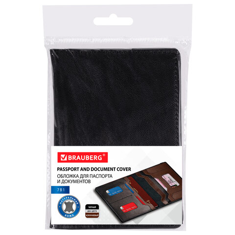 Обложка для паспорта и документов 7 в 1 натуральная кожа, без тиснения, черная, BRAUBERG