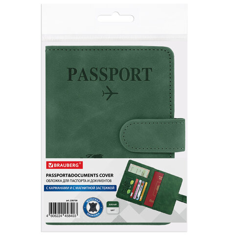 Обложка для паспорта и документов с защитой от считывания, 9 карманов, магнит, экокожа, зеленая, BRAUBERG