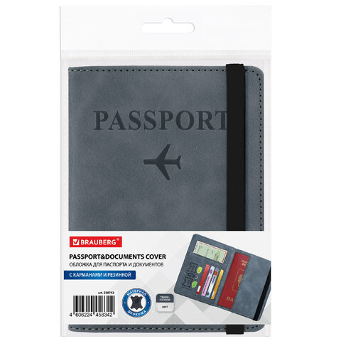 Обложка для паспорта и документов с защитой от считывания, 9 карманов, резинка, экокожа, темно-голубая, BRAUBERG