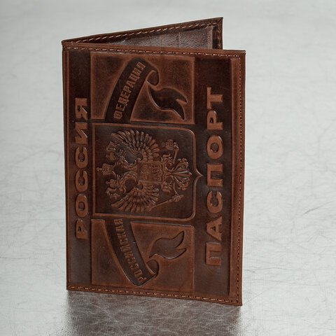Обложка для паспорта натуральная кожа краст, герб РФ + "ПАСПОРТ РОССИЯ", коньяк, BRAUBERG