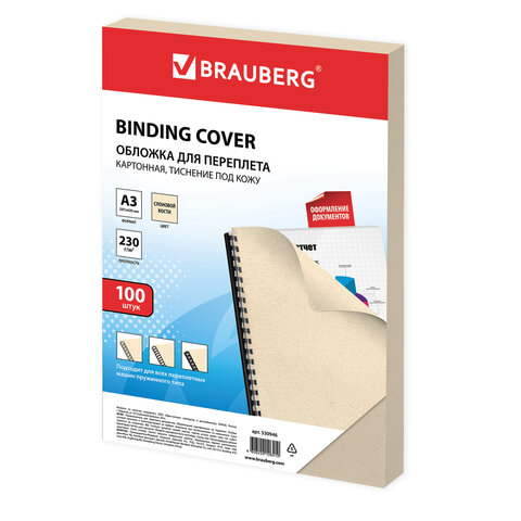 Обложки картонные для переплета БОЛЬШОЙ ФОРМАТ А3, КОМПЛЕКТ 100 шт., тиснение под кожу, 230 г/м2, слоновая кость, BRAUBERG