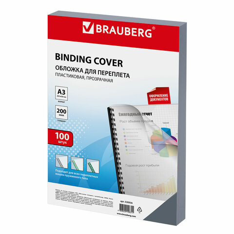 Обложки пластиковые для переплета БОЛЬШОЙ ФОРМАТ А3, КОМПЛЕКТ 100 шт., 200 мкм, прозрачные, BRAUBERG