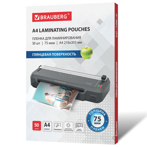 Пленки-заготовки для ламинирования А4, КОМПЛЕКТ 50 шт., 75 мкм, BRAUBERG