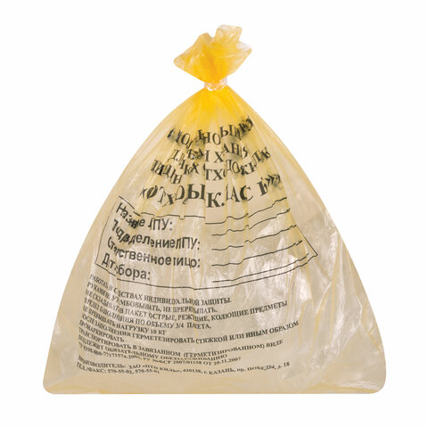 Пакеты для медицинских отходов КОМПЛЕКТ 100 шт., класс Б (желтые) 5 л, 33х30 см, 10 мкм, ПТП "Киль"