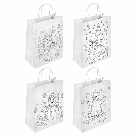 Пакет-раскраска НАБОР 8 шт., новогодний, 32х13х26 см + масляные пастельные мелки, ЗОЛОТАЯ СКАЗКА