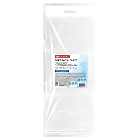 Пакеты БОПП с европодвесом, клеевым клапаном, КОМПЛЕКТ 100 штук, 13х27 + 3 + 4 см, белая подложка, BRAUBERG