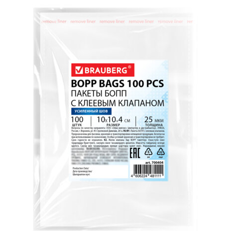 Пакеты БОПП с клеевым клапаном, КОМПЛЕКТ 100 штук, 10х10 + 4 см, 25 мкм, с усиленным швом, BRAUBERG