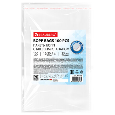 Пакеты БОПП с клеевым клапаном КОМПЛЕКТ 100 штук, 15х20 + 4 см, 25 мкм, с усиленным швом, BRAUBERG