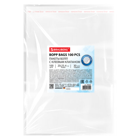 Пакеты БОПП с клеевым клапаном, КОМПЛЕКТ 100 штук, 20х25 + 4 см, 30 мкм, с усиленным швом, BRAUBERG