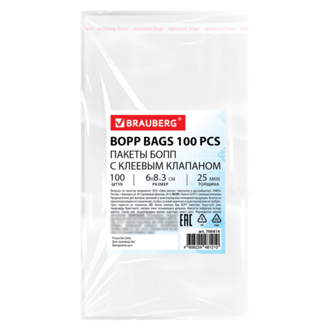 Пакеты БОПП с клеевым клапаном, КОМПЛЕКТ 100 штук, 6х8 + 3 см, 25 мкм, BRAUBERG