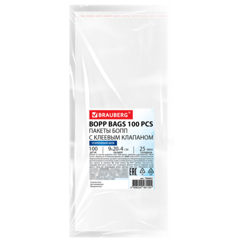 Пакеты БОПП с клеевым клапаном, КОМПЛЕКТ 100 штук, 9х20 + 4 см, 25 мкм, с усиленным швом, BRAUBERG