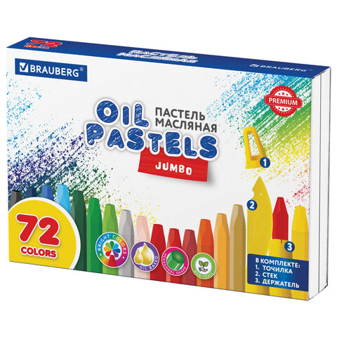 Пастель масляная восковые мелки утолщенные 72 цвета с точилкой, держателем и стеком, BRAUBERG PREMIUM