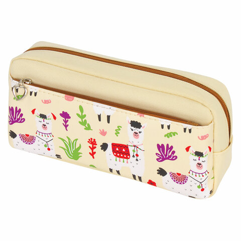 Пенал мягкий ЮНЛАНДИЯ, 2 отделения, полиэстер, "Llama", бежевый, 20х6х9 см
