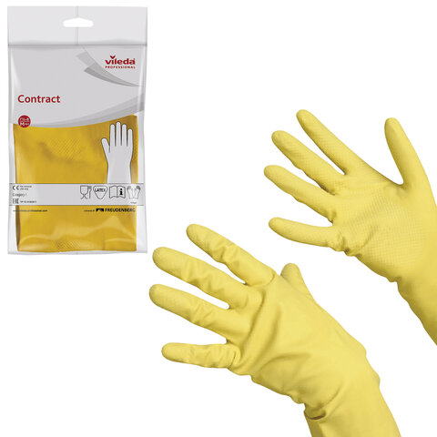 Перчатки МНОГОРАЗОВЫЕ резиновые VILEDA "Контракт", хлопчатобумажное напыление, размер 8,5-9, L (большой), желтые, вес 60 г
