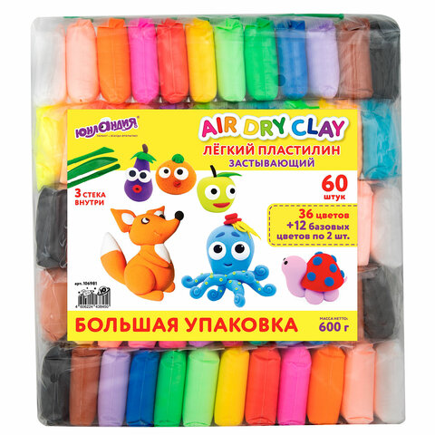 Пластилин супер лёгкий воздушный застывающий 60 штук (36 цветов + 12х2 базовых), 600 г, 3 стека, ЮНЛАНДИЯ