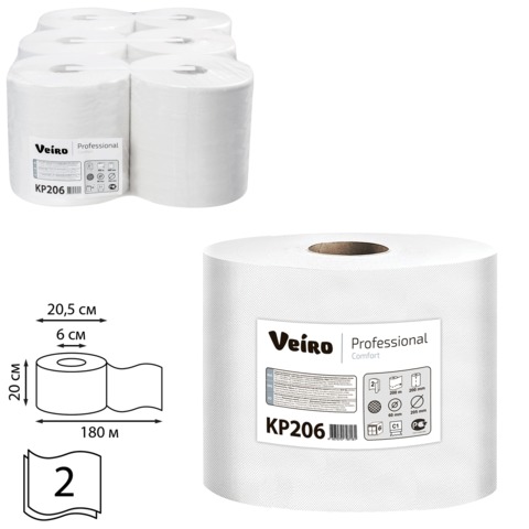 Полотенца бумажные с центральной вытяжкой VEIRO (Система M2/C1), комплект 6 шт., Comfort, 180 м, 2-слойные, белые, KP206