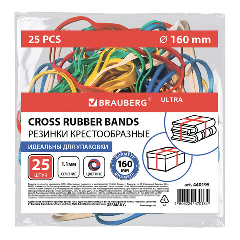 Резинки КРЕСТООБРАЗНЫЕ упаковочные, диаметр 160 мм, 25 шт., цветные, каучук, BRAUBERG