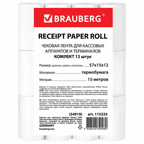 Чековая лента ТЕРМОБУМАГА 57 мм (диаметр 33 мм, длина 15 м, втулка 12 мм) КОМПЛЕКТ 12 шт., BRAUBERG