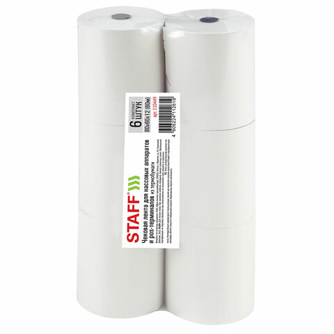 Чековая лента ТЕРМОБУМАГА 80 мм (диаметр 66-73 мм, длина 60 м, втулка 12 мм) КОМПЛЕКТ 6 шт., STAFF