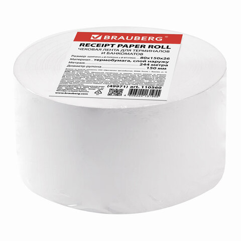 Чековая лента ТЕРМОБУМАГА 80 мм (диаметр 150 мм, длина 244 м, втулка 26 мм) слой наружу, BRAUBERG