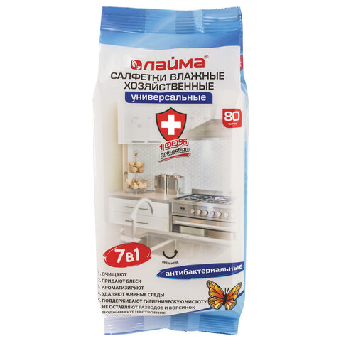 Салфетки влажные хозяйственные LAIMA "УНИВЕРСАЛЬНЫЕ "7 в 1", антибактериальные, 80 шт.
