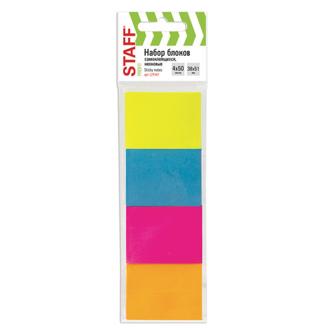 Блок самоклеящийся (стикеры) STAFF, НЕОНОВЫЙ, 38х51 мм, 50 листов, НАБОР 4 штуки, ассорти
