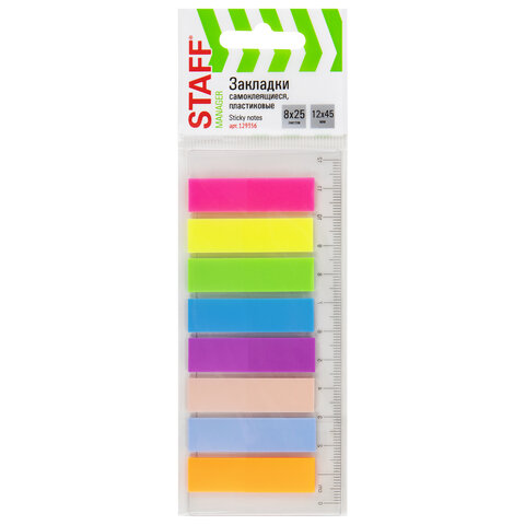 Закладки клейкие неоновые STAFF, 45х12 мм, 200 штук (8 цветов х 25 листов), на пластиковой линейке 12 см