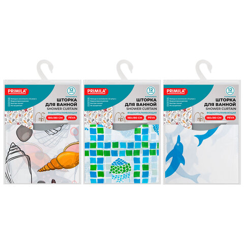 Шторка для ванной PEVA, 180х180 см, кольца в комплекте, 3 дизайна ассорти, МОРЕ, PRIMILA (ПРИМИЛА)