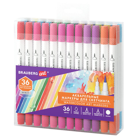 Маркеры акварельные для скетчинга двусторонние (кисть и линер) 36 цветов, BRAUBERG ART