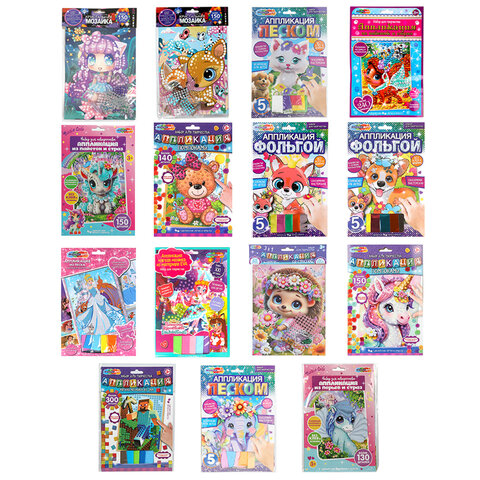 Аппликация АССОРТИ 15 видов, 17х23 см, перья, эва, фольга, мозаика, на картоне, МУЛЬТИ АРТ