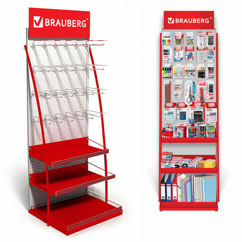 Стойка для размещения товара напольная BRAUBERG, 2050x600x500 мм, 25 крючков, 3 полки, металл