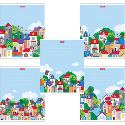 Тетрадь 12 л. HATBER клетка, обложка картон, "Городок" (5 видов в спайке), 12Т5В1