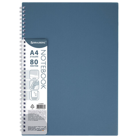 Тетрадь обложка пластик, А4 80 л., гребень мягкий (силиконовый), клетка, BRAUBERG, синий