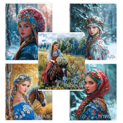 Тетрадь А5, 48 л., BRAUBERG, скоба, клетка, глянцевый лак, Русская красавица (микс в спайке)