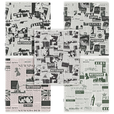 Тетрадь А5, 48 л., BRAUBERG, скоба, клетка, TWIN-лак, "Газета" (микс в спайке)