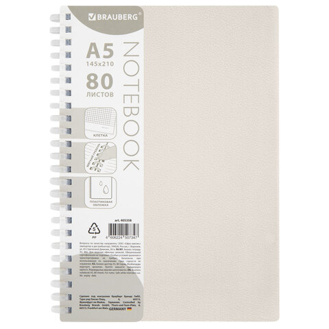 Тетрадь обложка пластик, А5 80 л., гребень мягкий (силиконовый), клетка, BRAUBERG, бежевый