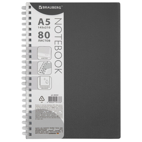 Тетрадь обложка пластик, А5 80 л., гребень мягкий (силиконовый), клетка, BRAUBERG, серый